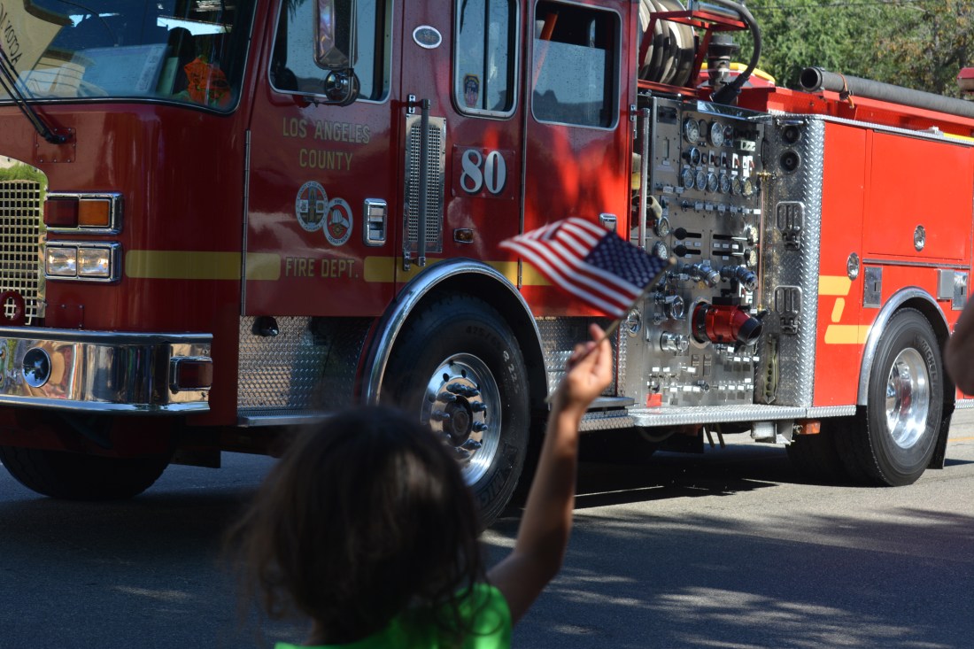 המצעד הולך ככה: פותחים שורה של אנשי חיל האוויר צועדים בסך עם מדים ודגלים, ומטס של ארבעה מטוסים מלמעלה (אין לי מושג איך השיגו). אחריהם עוברים במכוניותיהם נציגי זרועות השלטון השונות: ניידות משטרה, כבאיות אש, ריינג'רים, רשות הפארקים, שיטור קהילתי, משטרת תנועה. כולם מטעם מחוז לוס אנג'לס או מדינת קליפורניה, כי אין לאקטון עירייה או זרועות שלטון משלה. וכולם מנופפים בידיים ובדגלים לקהל הצופים.