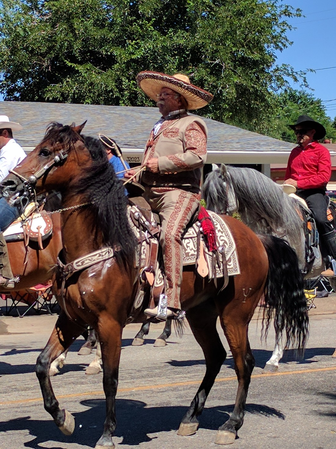 אבל חלק מהם הגיעו על הסוסים שלהם, בבגדי רכיבה יפים או או בגדים אקסטרווגנטיים יותר, ועשו תרגילי רכיבה או הרקידו את הסוסים כל הדרך. הכי אהבתי את הרוכבים ממוצא מקסיקני, שחלקם באו גם בנציגות מסודרת של איגוד הבוקרים Union de Charros, ובאו בבגדים מקסיקניים מסורתיים נהדרים עם מכנסיים וג'קטים מעוטרים ואבזמים וסומבררוז, ושמלות ספרדיות מרהיבות עם קפלי-קפלים צבעוניים שנמשכות הלאה והלאה ומכסות לא רק את הרוכבת אלא גם את כל הגב של הסוס עד הזנב. וכולם תחת דגלי ארה"ב ומדינת קליפורניה ומנופפים לכל עבר.
